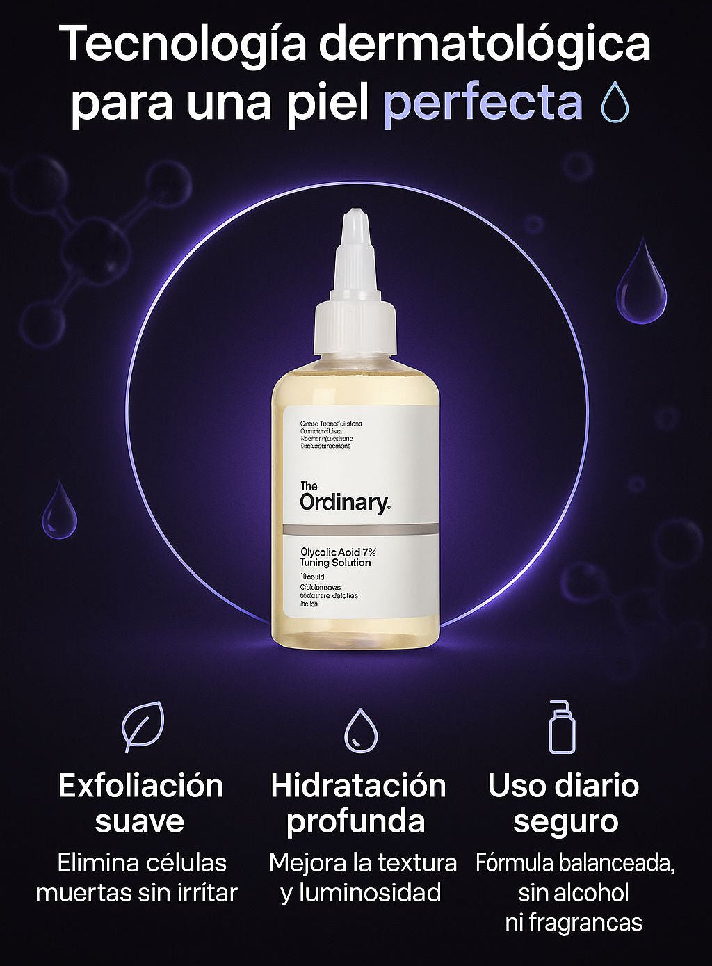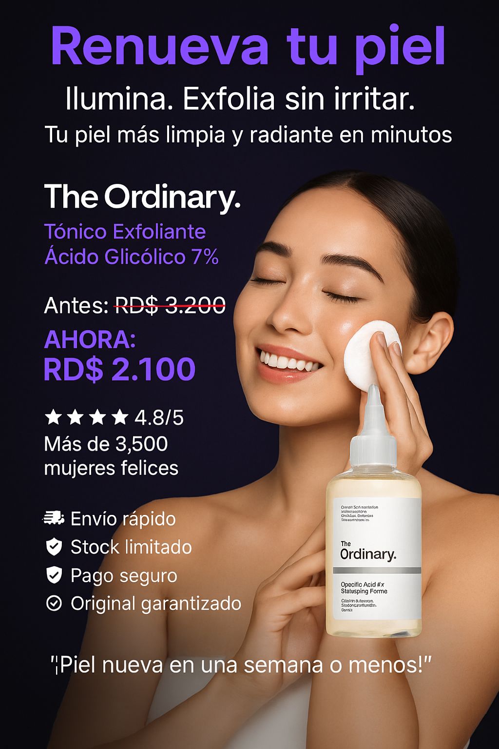 "Llevo dos semanas usando el ácido glicólico de The Ordinary y mi piel cambió por completo 😍. Está más lisa, con menos textura y el brillo es real ✨."